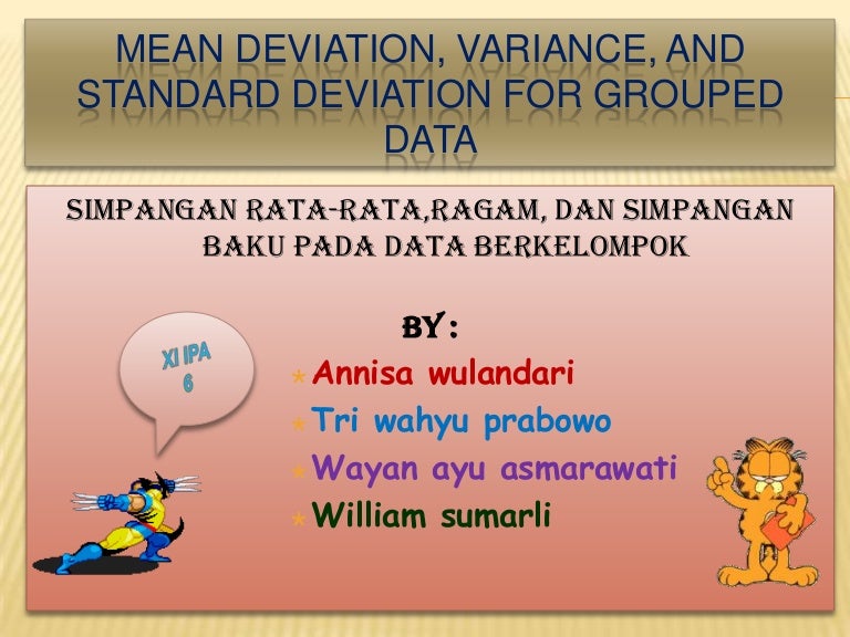 Contoh Soal Ragam Varians Data Kelompok / Rangkuman Contoh Soal Statistika Pembahasan Jawaban : Dari 40 orang siswa diambil sampel 9 orang untuk diukur tinggi badannya diperoleh data berikut.. Pembahasan contoh soal median data kelompok posted by edutafsi on 21 may 2015 418 pm dari sebuah tabel diketahui bahwa data memiliki interval kelas 5 jumlah semua frekuensi data sama dengan 100 dan jumlah semua frekuensi sebelum median sama dengan 20. Berdasarkan pengambilan sampel nilai ujian mata pelajaran beberapa siswa di smp bahagia diketahui data sebagai berikut analisis varians statistika penelitian. Berikut ini terdapat beberapa contoh dari standar deviasi, diantaranya: Akar varians = standar deviasi atau simpangan baku σ² = varians populasi, σ = standar deviasi populasi s² = varians sampel, s. 10, 44, 56, 62, 65, 72, 76 2.